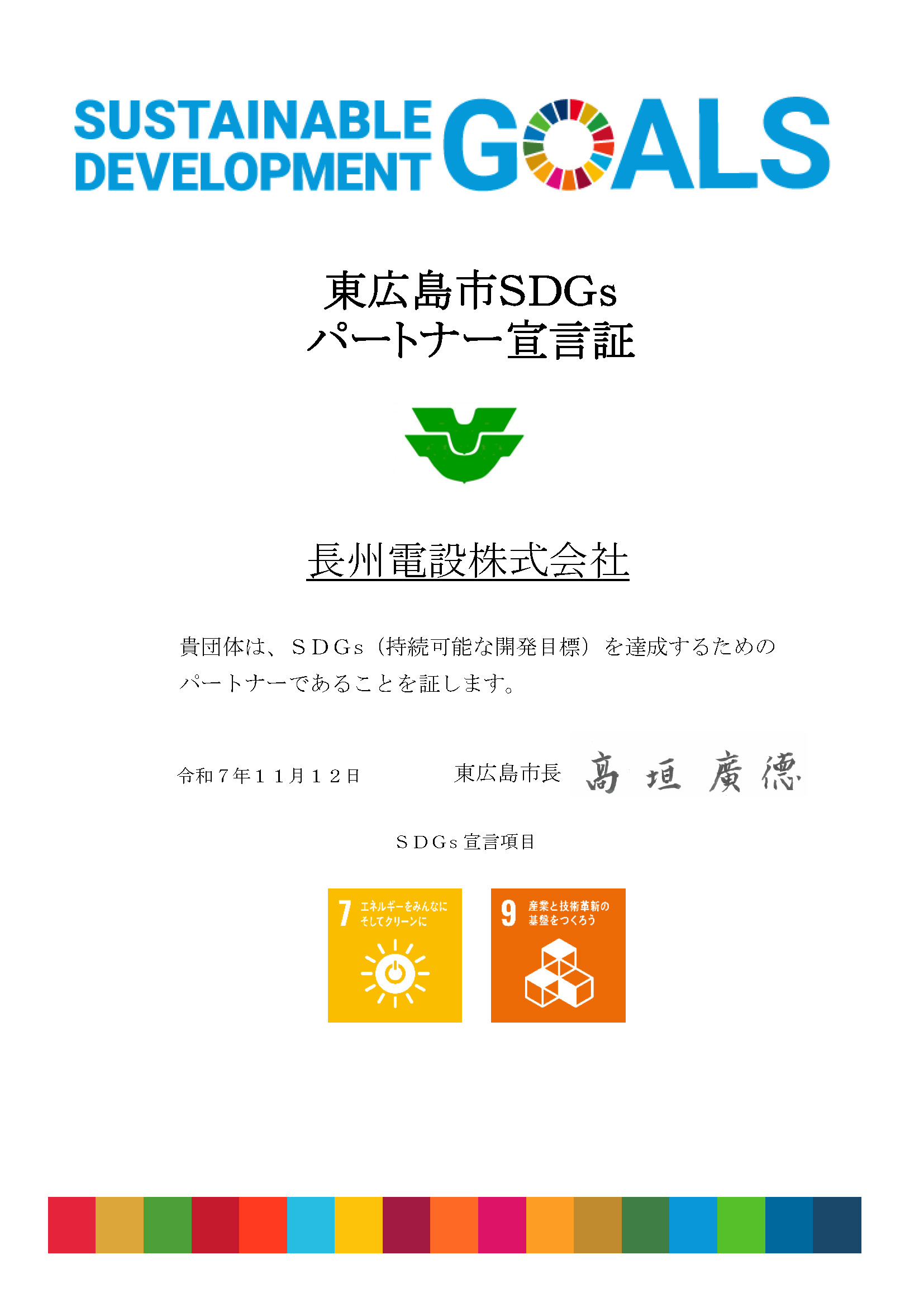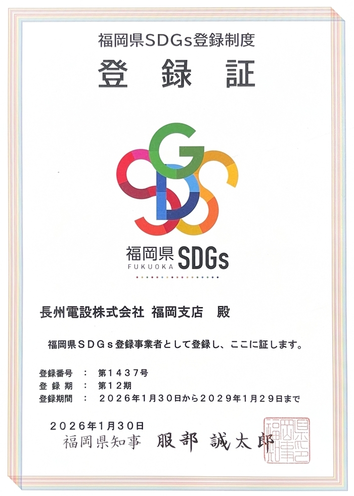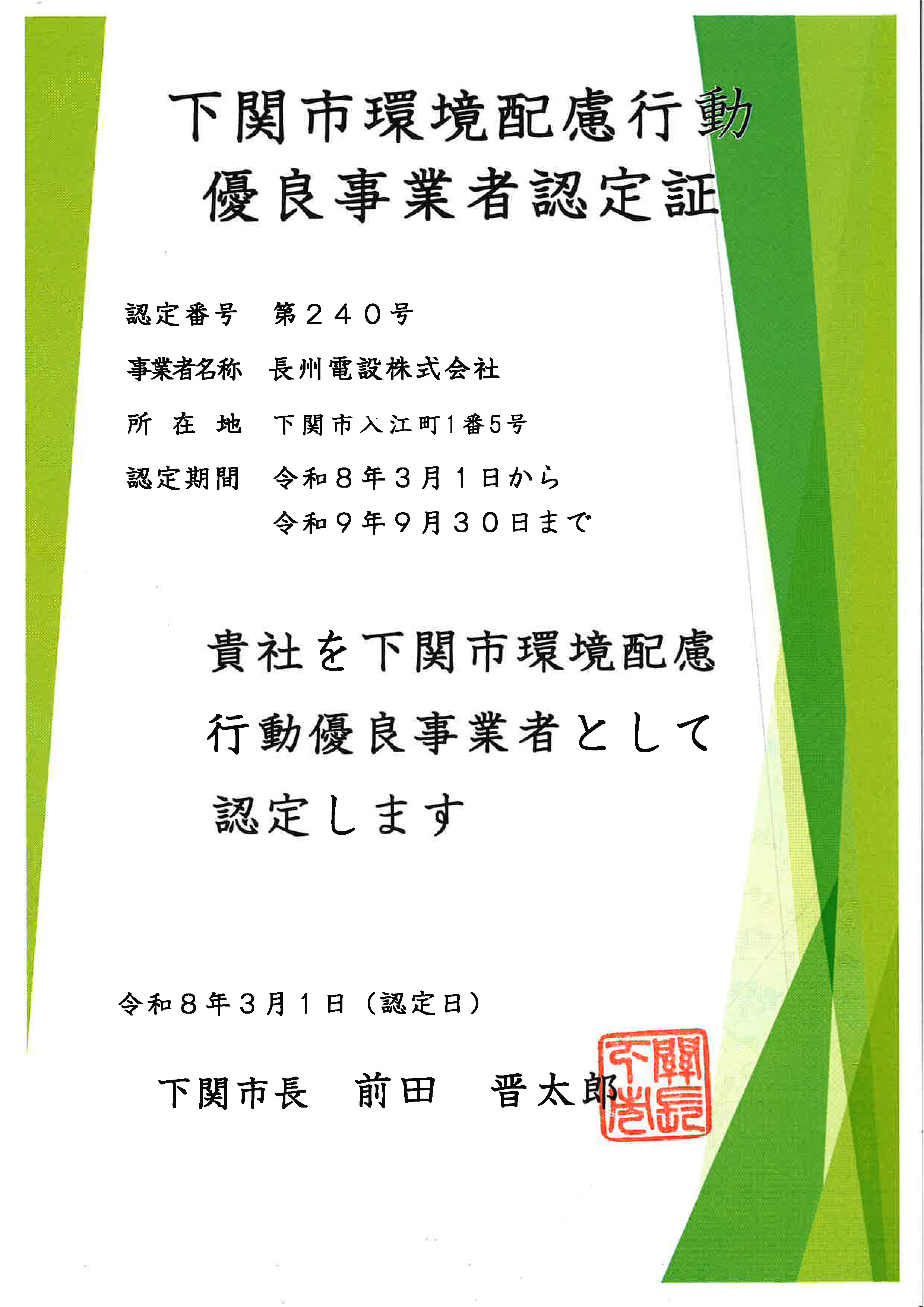 長州電設株式会社は、下関市より環境に配慮した事業活動を行う企業として**「下関市環境配慮 行動優良事業者」**の認定を受けましたことをご報告いたします。
